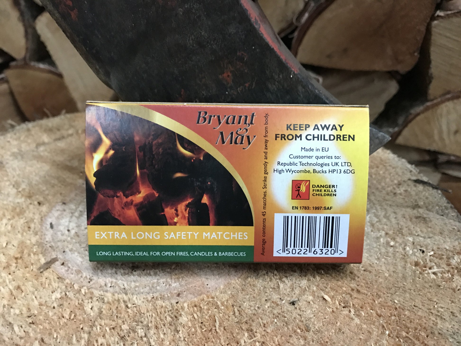 These Bryant and May matches are a quality product, they are extra long to give a longer burn time, giving more time to light the fire and reduces the risk of burning fingers. These extra long matches also make it easier to reach your fire lighter when stacked in between the kindling sticks. We recommend one box per bulk bag of logs (approx. 45 matches in a pack).